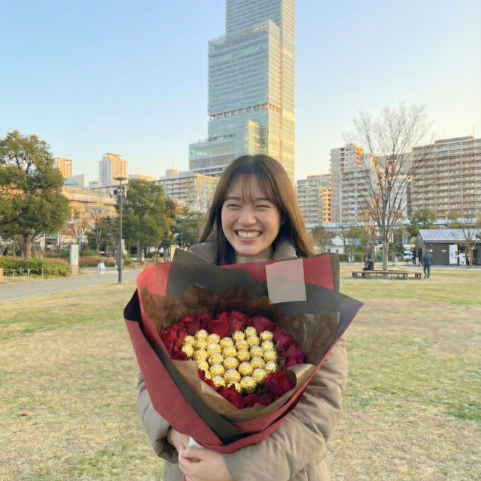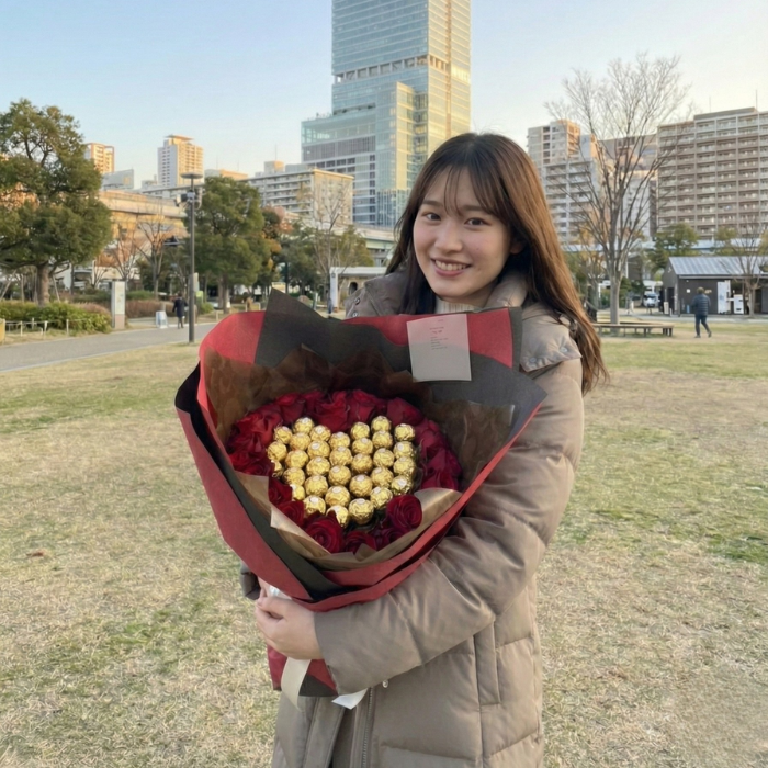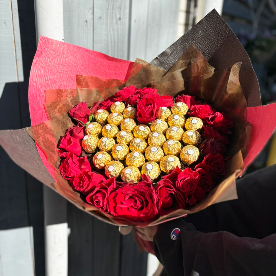 赤バラとチョコレートを贅沢に使用。バレンタインギフトにおすすめの赤バラとロシェチョコのブーケです。