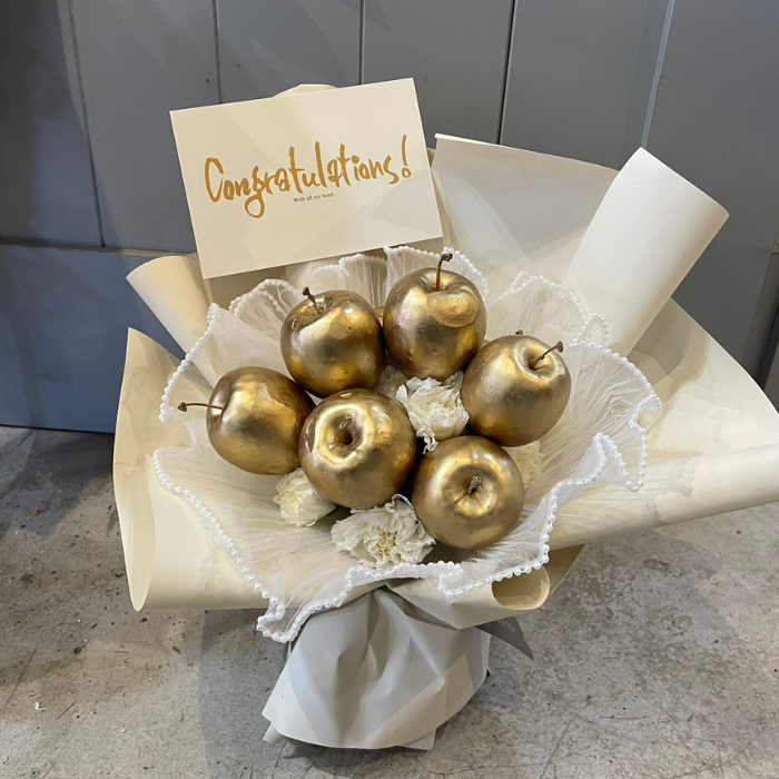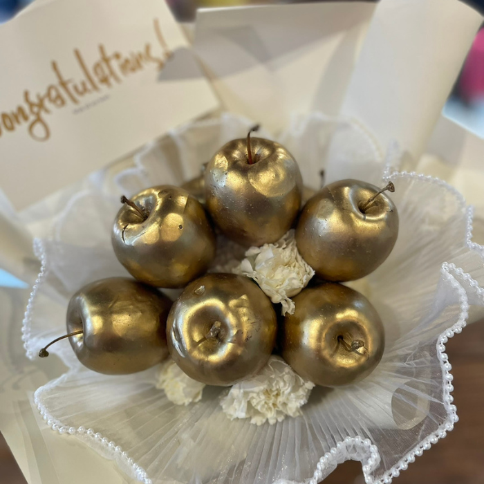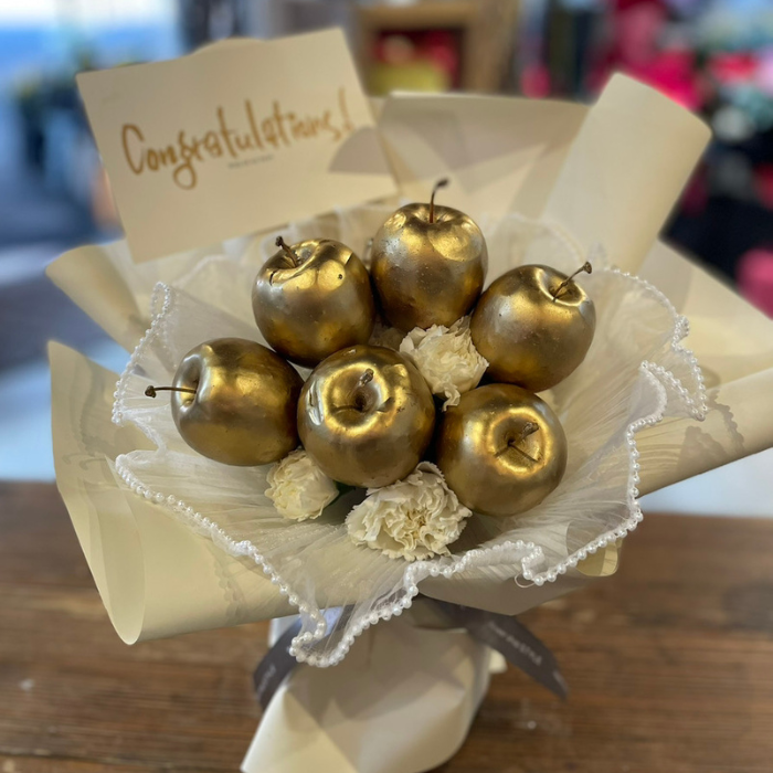 コロンとしたフォルムが愛らしいリンゴに、一点ずつ丁寧に金色のスプレーで特殊加工を施した「ゴールドアップル」。 その黄金の輝きを引き立てる純白のお花を合わせ、上品かつインパクトのあるブーケに仕上げました。