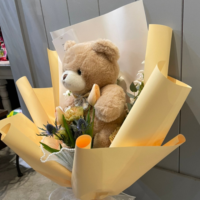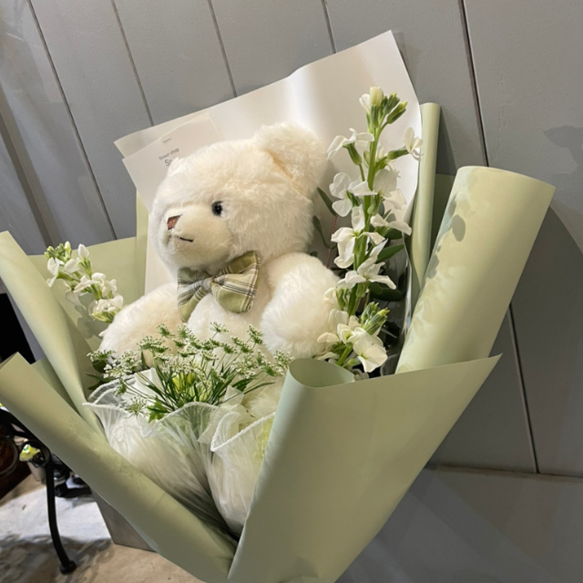 ふわふわのくまさんと季節の生花を組み合わせた華やかなギフトブーケです。